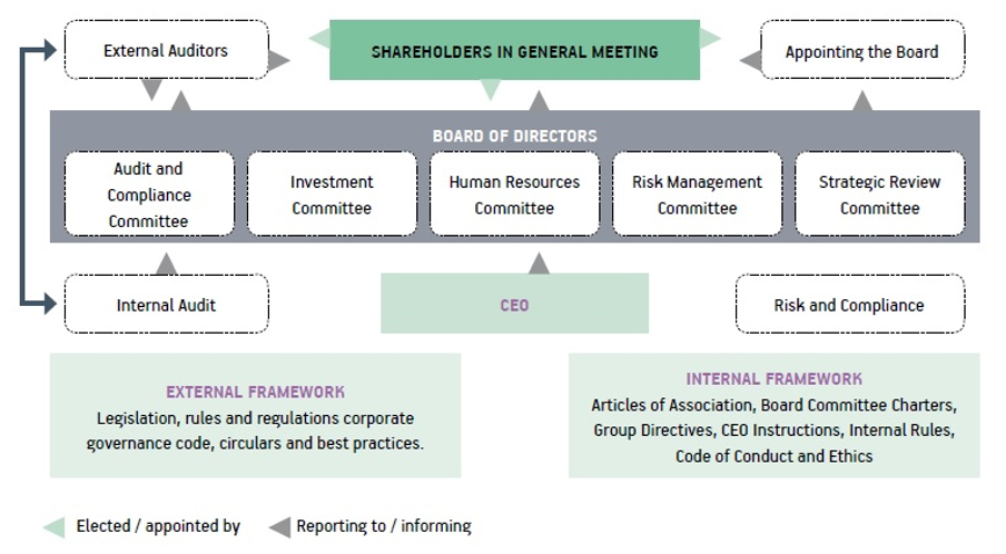 நிறுவனம் தனது பணிப்பாளர்கள் குழு மற்றும் குழுவின் துணைக்குழுக்கள் மூலம் முறையான கொள்கைகள், நடைமுறைகள், வழிகாட்டுதல்கள் மற்றும் தொடர்புடைய முகாமைத்துவ அறிக்கை வரிகள் உட்பட அதன் செயல்பாடுகளின் அனைத்து பகுதிகளிலும் ஒரு நிர்வாக கட்டமைப்பை பராமரிக்கிறது.